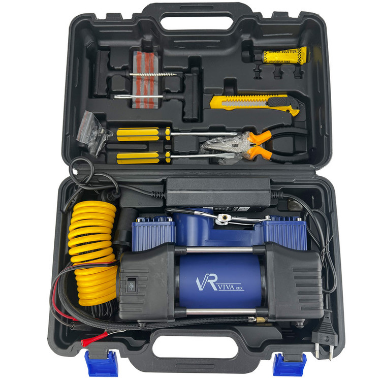 اقلام همراه : تبدیل برق شهری به ۱۲ ولت - لوازم کامل : چسب پنچرگیری دو عدد درفش ۳عدد کرمک پنچرگیری تیغ کاتر ۳عدد سوزن دوعدد پیچ گوشتی شلنگ رابط رابط اتصال فندکی به باطری - کیف
